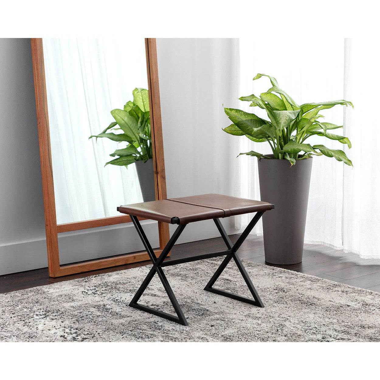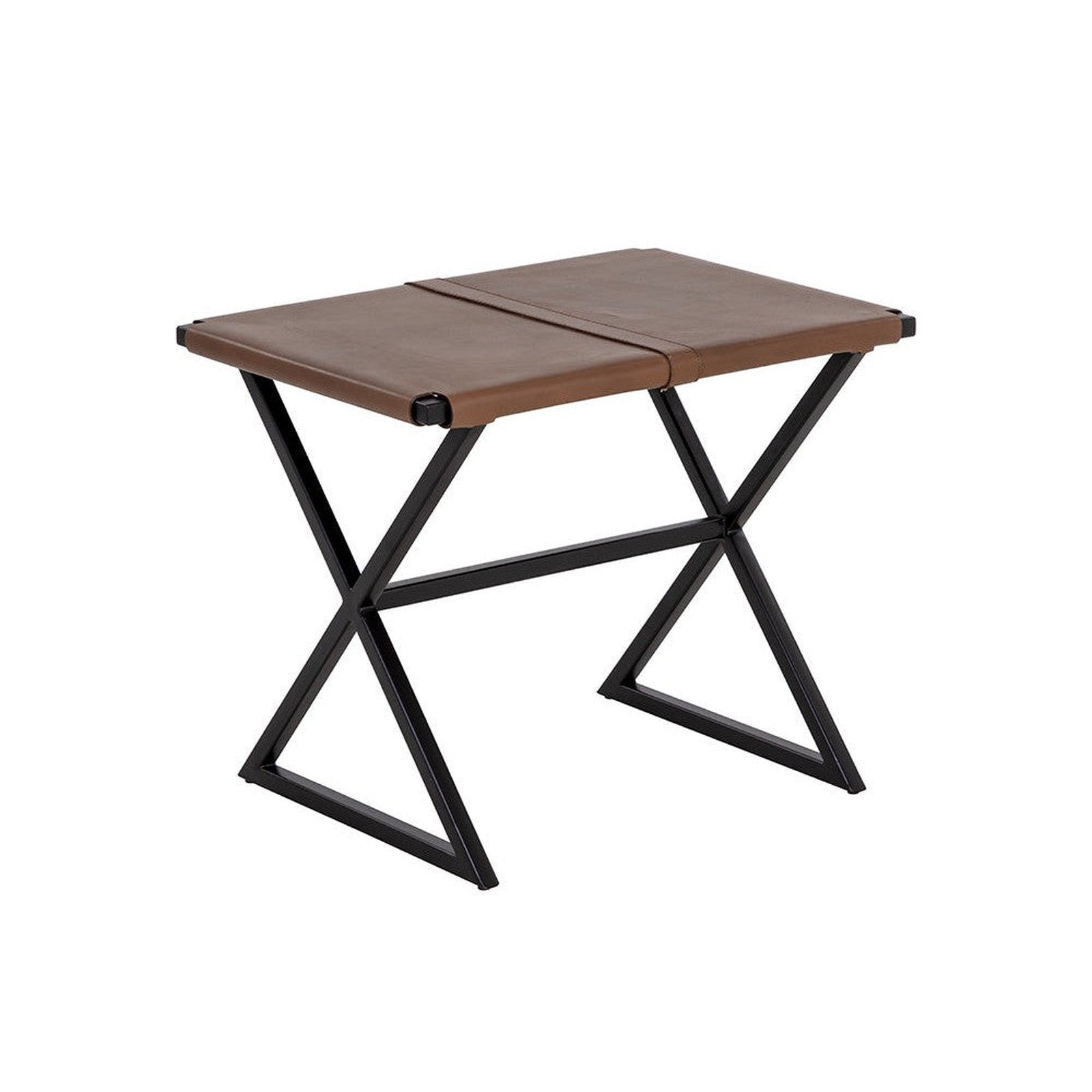 - Upholstered in vintage cognac leather and completed with a matte black powder coated base.