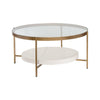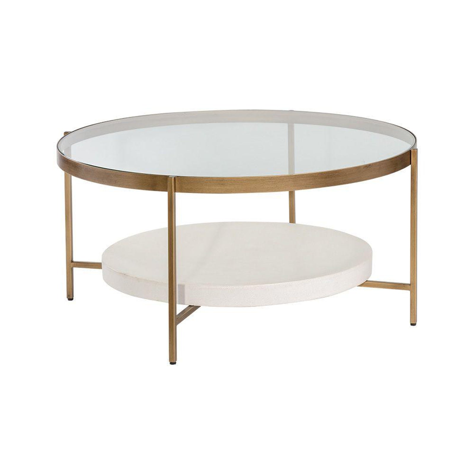 - A beautiful round glass top and white concrete shelf are supported by a brushed antique brass finished steel frame.