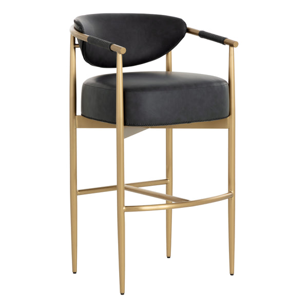 Every detail that makes up the handsome Heloise Barstool is designed with purpose. Bravo black faux leather upholstery and rope detailing is paired with powder-coated gold stainless steel for optimal style and comfort. Visible stitching on the seat and backrest accentuates the chair's smooth contours. This elegant barstool will perfectly complement any dining space. Handle With Care: This design has been crafted with faux leather. Faux leather is manufactured to reflect the natural characteristics of leather; as such, colour variations, markings, wrinkles, grooves, and light scratches are appreciated characteristics. No two pieces will be alike. Visit our Product Care page for more information on how to ensure the lasting beauty of this piece.