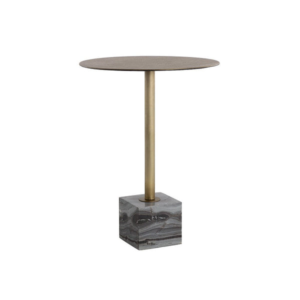 - Features a brushed antique brass frame with mesh patterning on the tabletop.