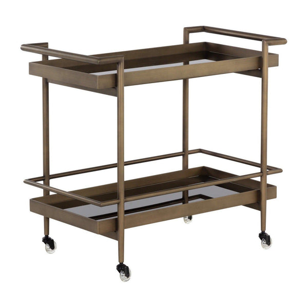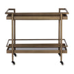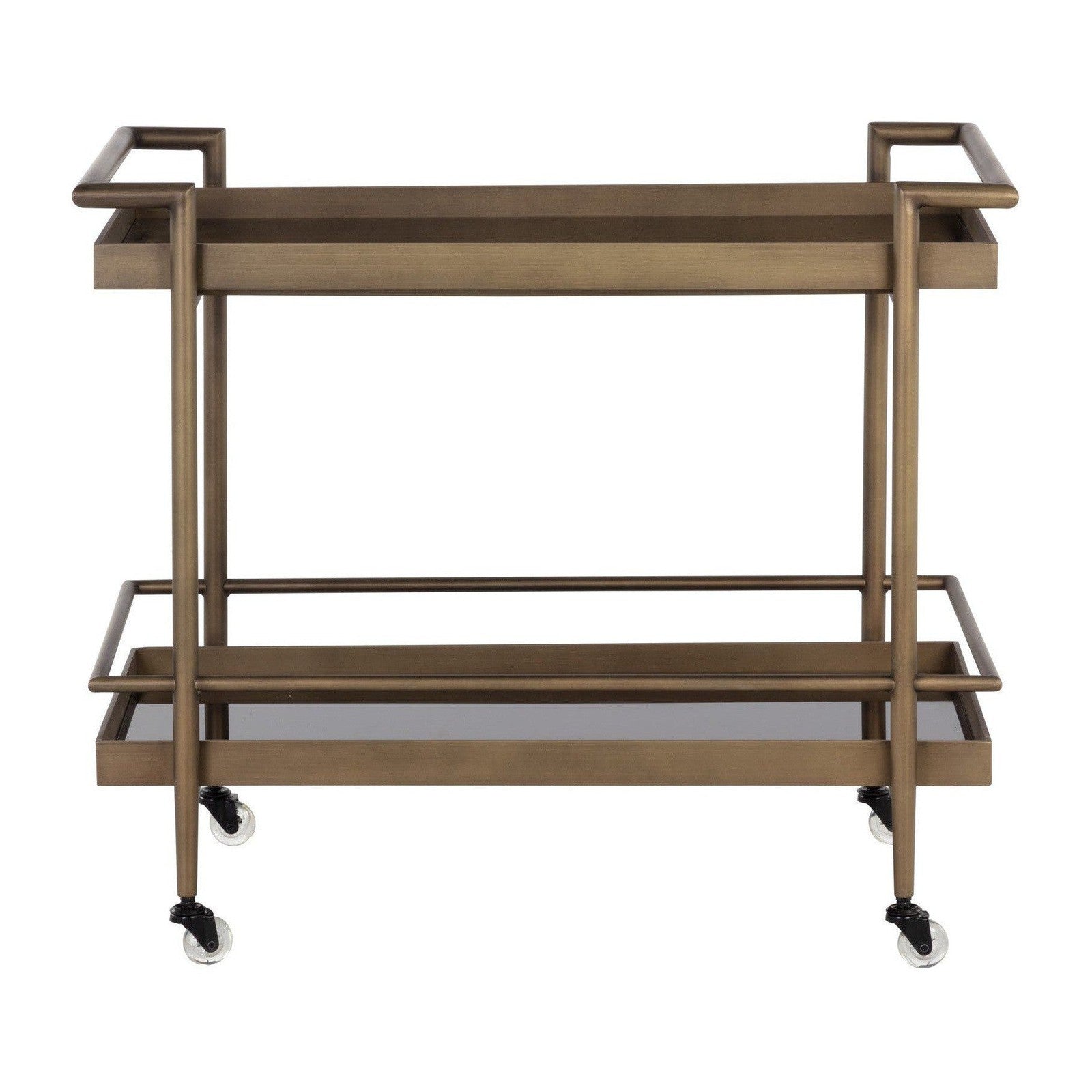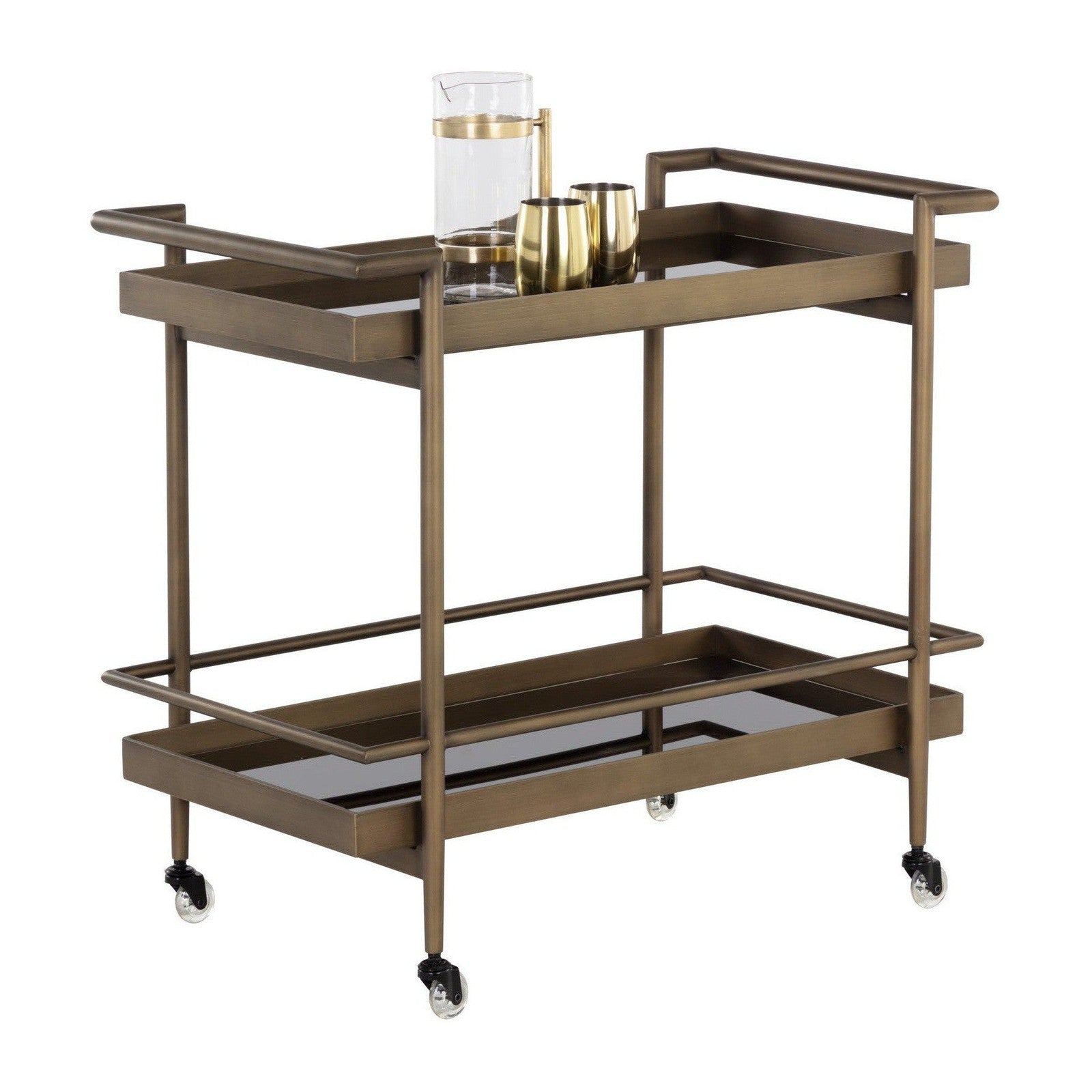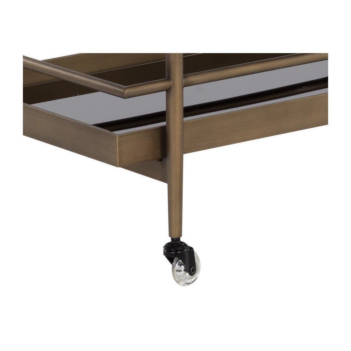 - A truly versatile and stylish bar cart featuring sleek, black glass shelving with an antique brass stainless steel tubular frame and legs