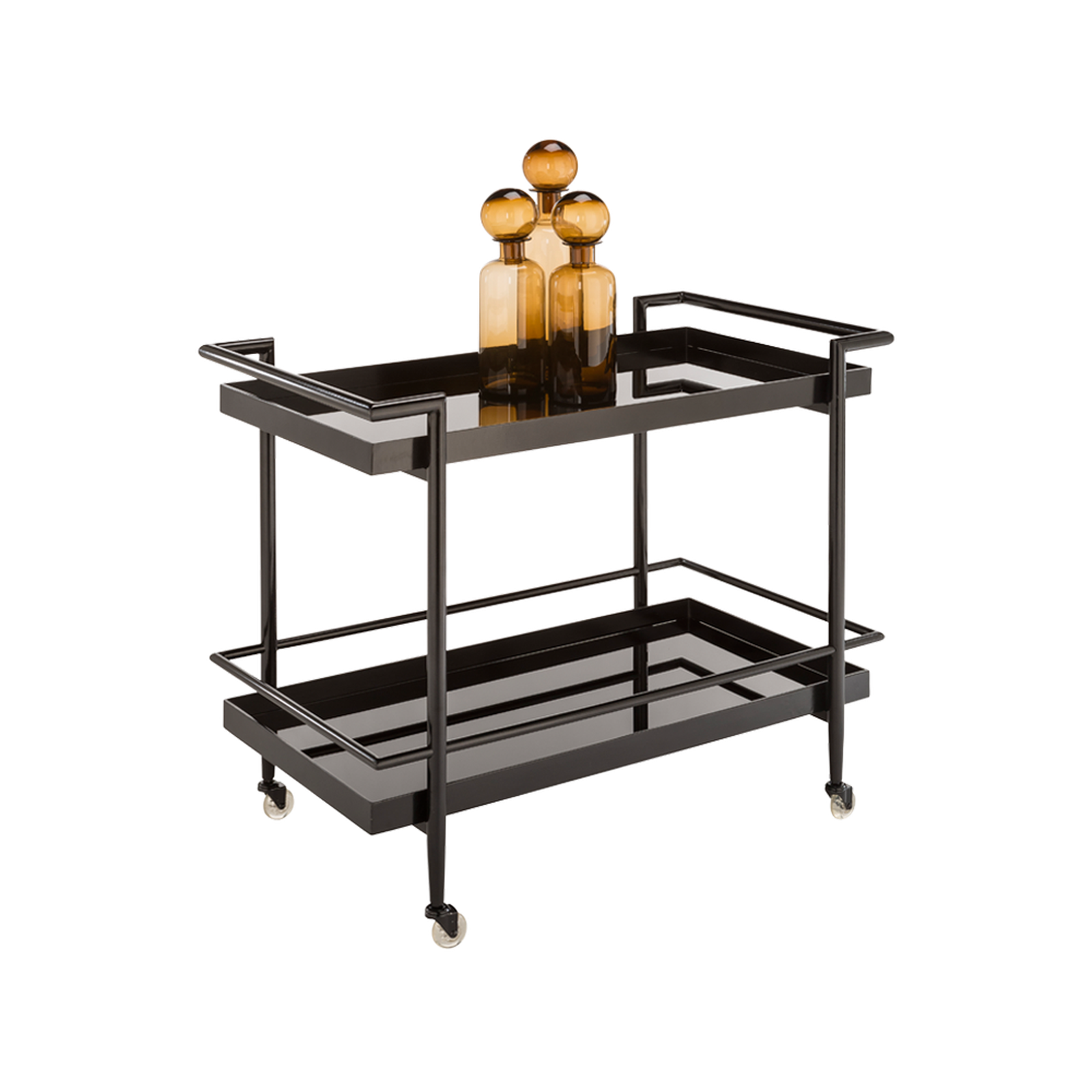 A truly versatile and stylish bar cart from our Ikon collection. Features coordinating sleek black glass with a surrounding black stainless steel tubular frame and legs. Castors allow for easy mobility.