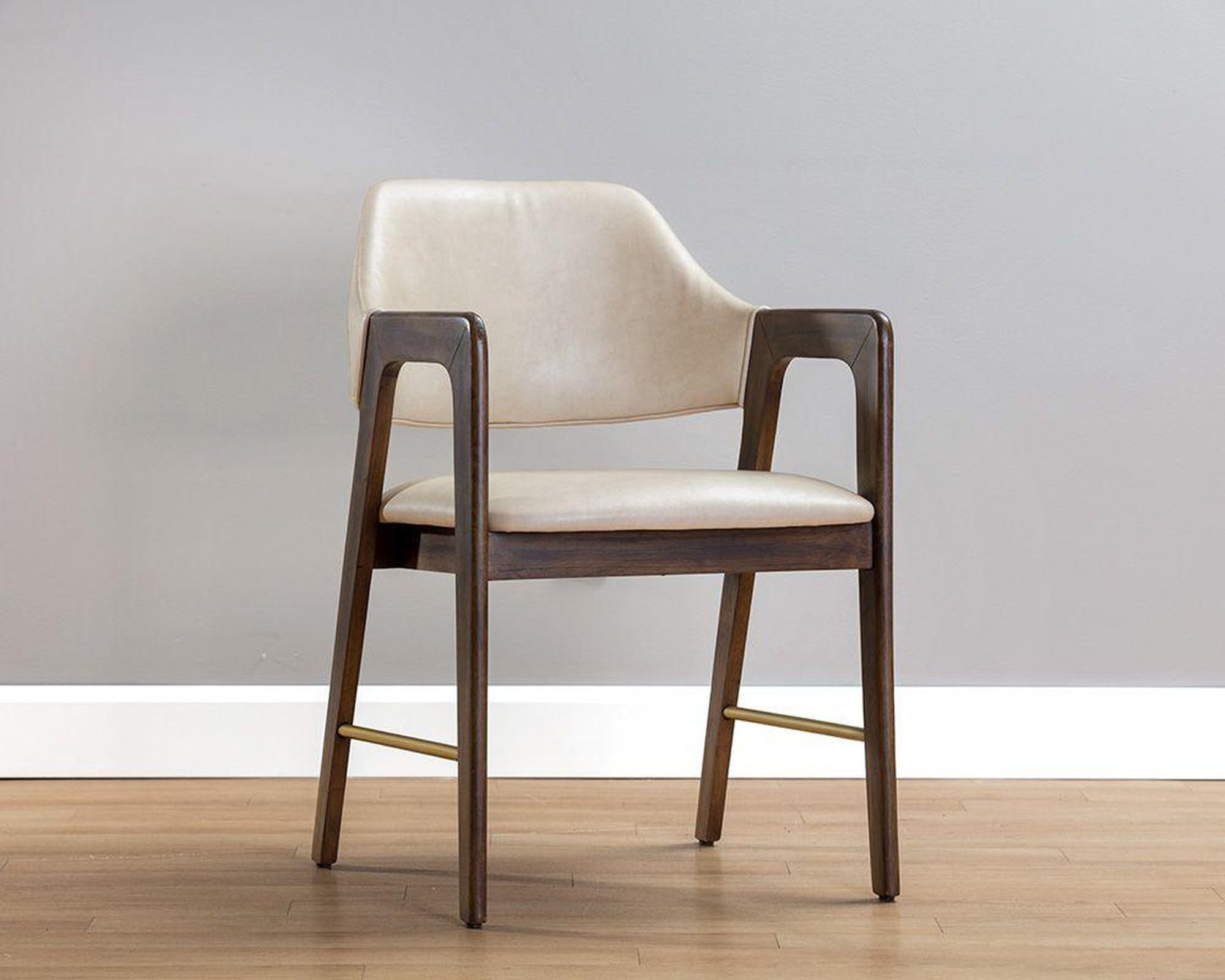 - Stocked in bravo cream faux leather, leo olive fabric with an exposed solid rubber wood frame and antique brass stretchers.