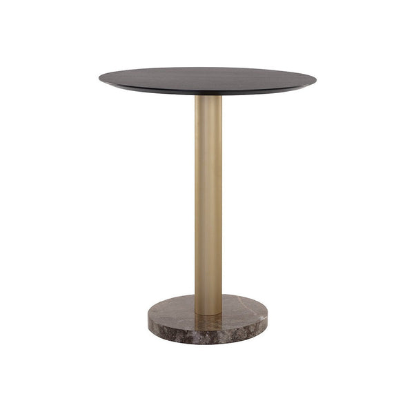 - Features a substantial light grey marble top and brushed gold iron base with a charcoal grey finished oak wood veneer top.