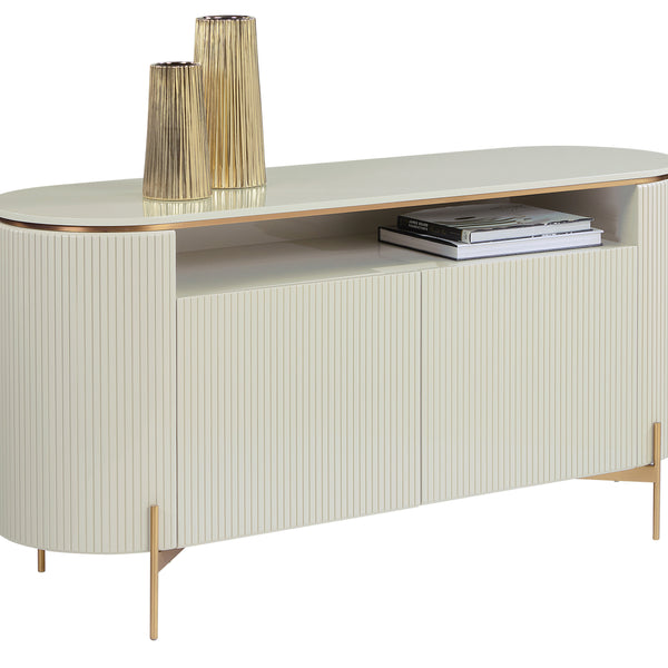 This luxurious sideboard will bring a sculptural spirit to modern living, lounge and dining spaces. The curved frame, finished in high gloss cream, is contrasted with intricate vertical reeding. Gold stainless steel legs and inlay create added definition.