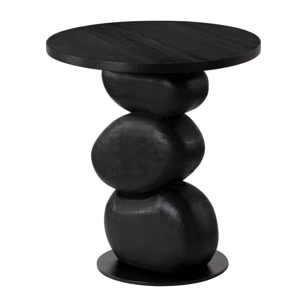 - Incredibly sturdy and compact, this end table is crafted from mango wood with a powder-coated finish and displays a distinctive base reminiscent of a stack of rocks