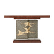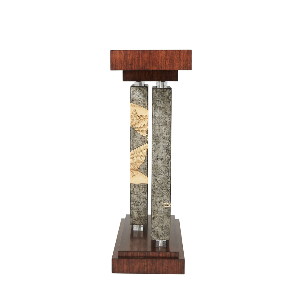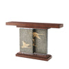 - A Hyedua veneered console table, the rectangular top supported by two offset pewter Argento panels painted with flying cranes and with acrylic bases and capitals, on a stepped plinth base.