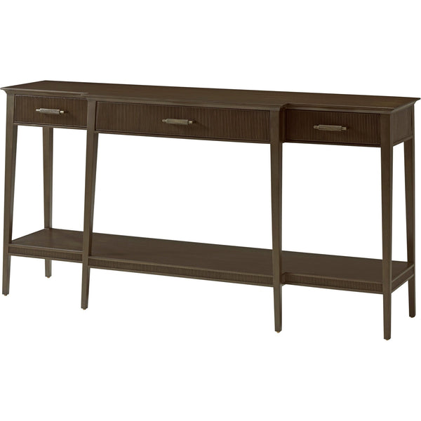 - The Lido Console II, crafted from Prima Vera veneer in our dark Bistre finish, features an elegantly tapered silhouette, reeded detailing, three drawers and a shelf.