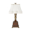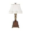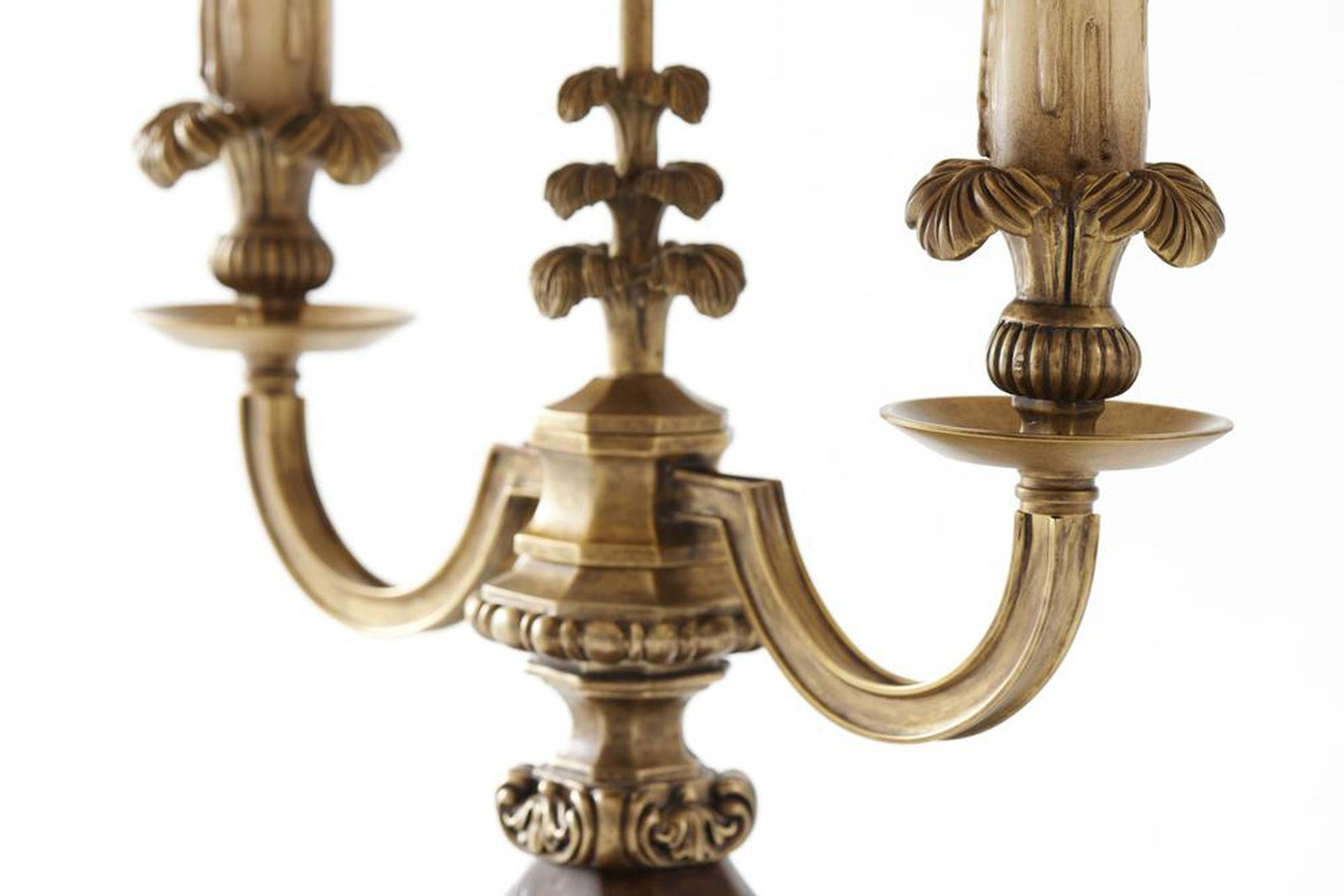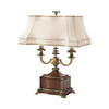 - A pollard burl and finely cast brass table lamp, the twin light arms above a shaped base with brass mounts surmounted by hand sewn silk shade.