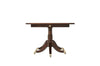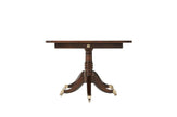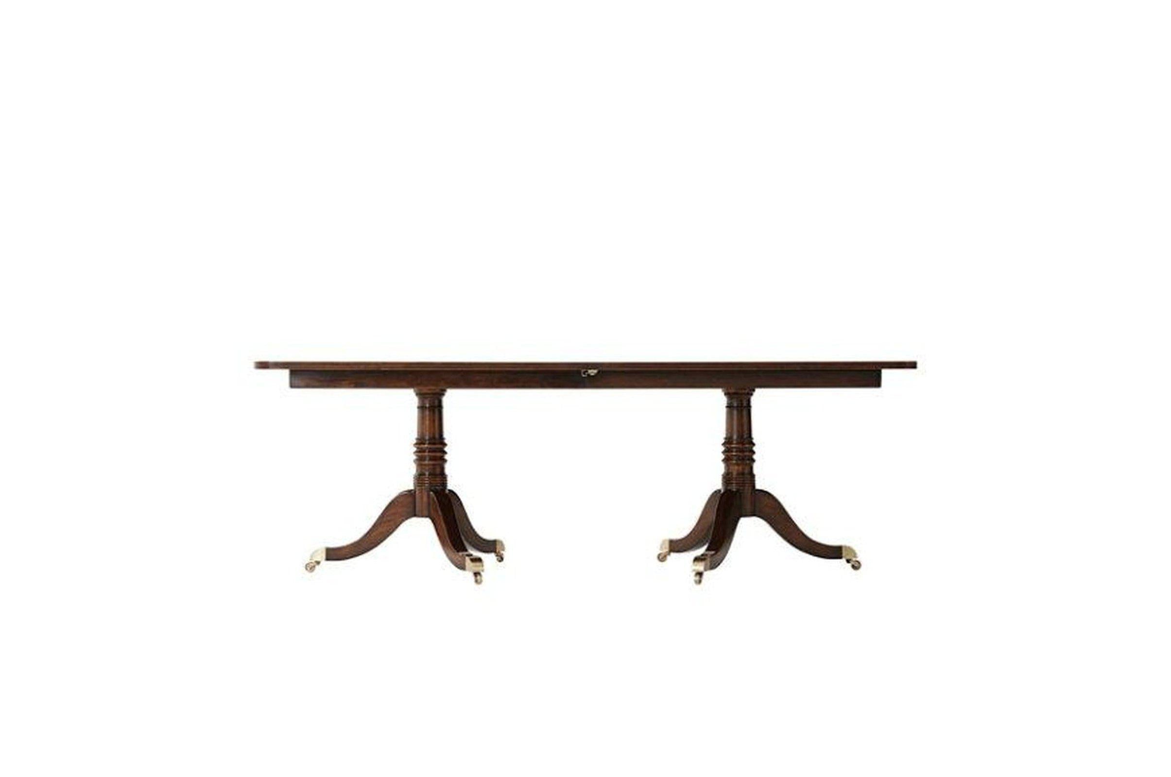 - A swirl mahogany veneered dining table, the rectangular reeded edge and satinwood banded top extending to accommodate one additional leaf, on two gun-barrel turned column pedestals with downswept legs terminating in brass cappings and castors. Inspired by a Regency original.