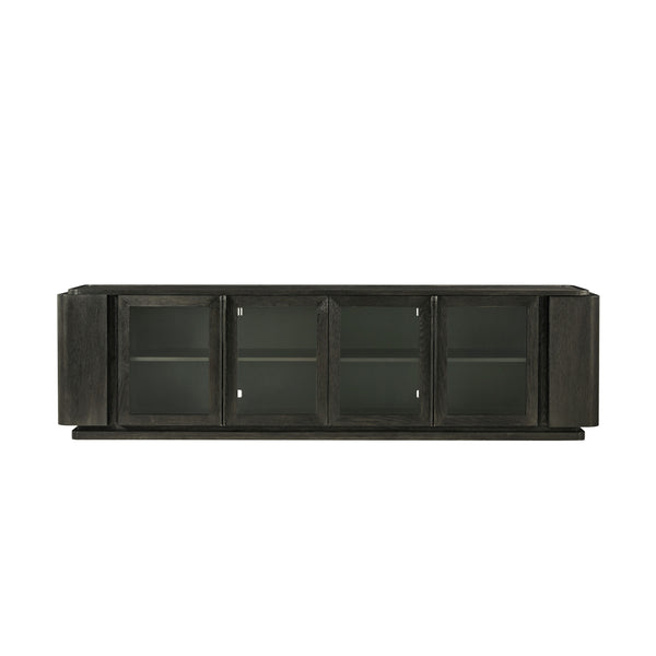 - Hidden on The Ends are Curved Doors that Conceal 2 Small Shelves to Store Away Small Items While The Front has 4 Spacious Cabinets with Adjustable Shelves and Glass Doors to Permit The Use of Remote Controls While Protecting The Components.