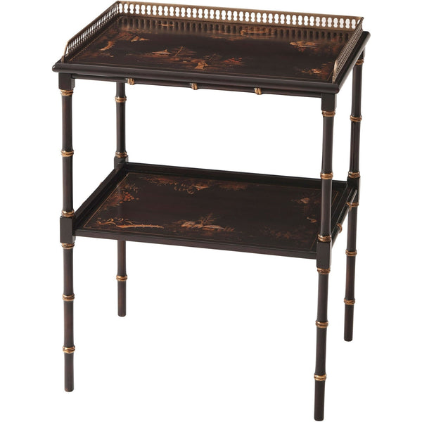 - An imbuya burl and Chocolate Chinoiserie hand-painted lamp table, the rectangular top with a fine brass gallery above ring turned legs joined by an undertier.