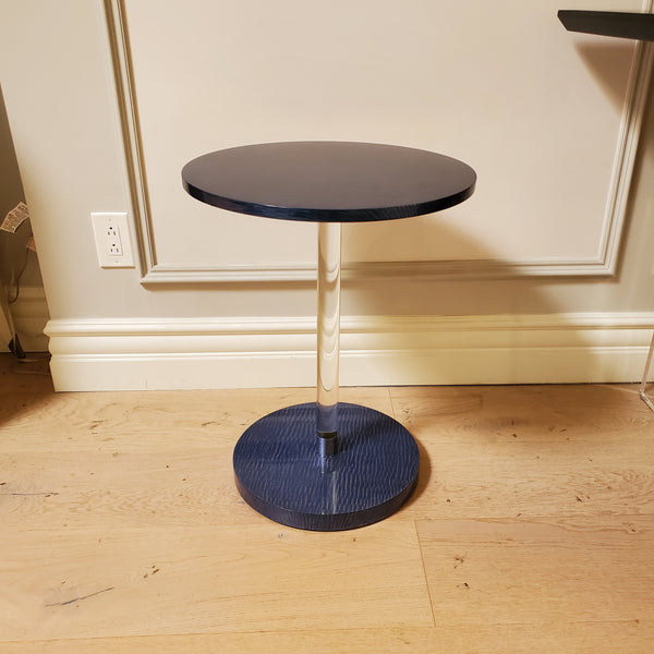 - A silver striated blue lacquer accent table, the circular top and base joined by a glass column with stainless steel terminals.