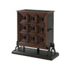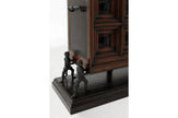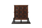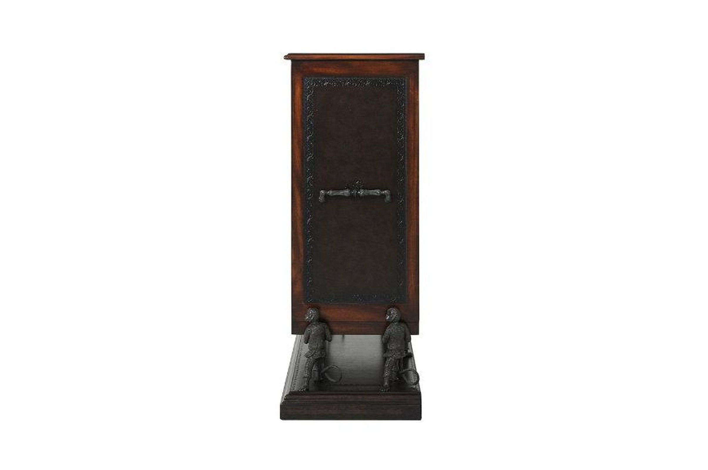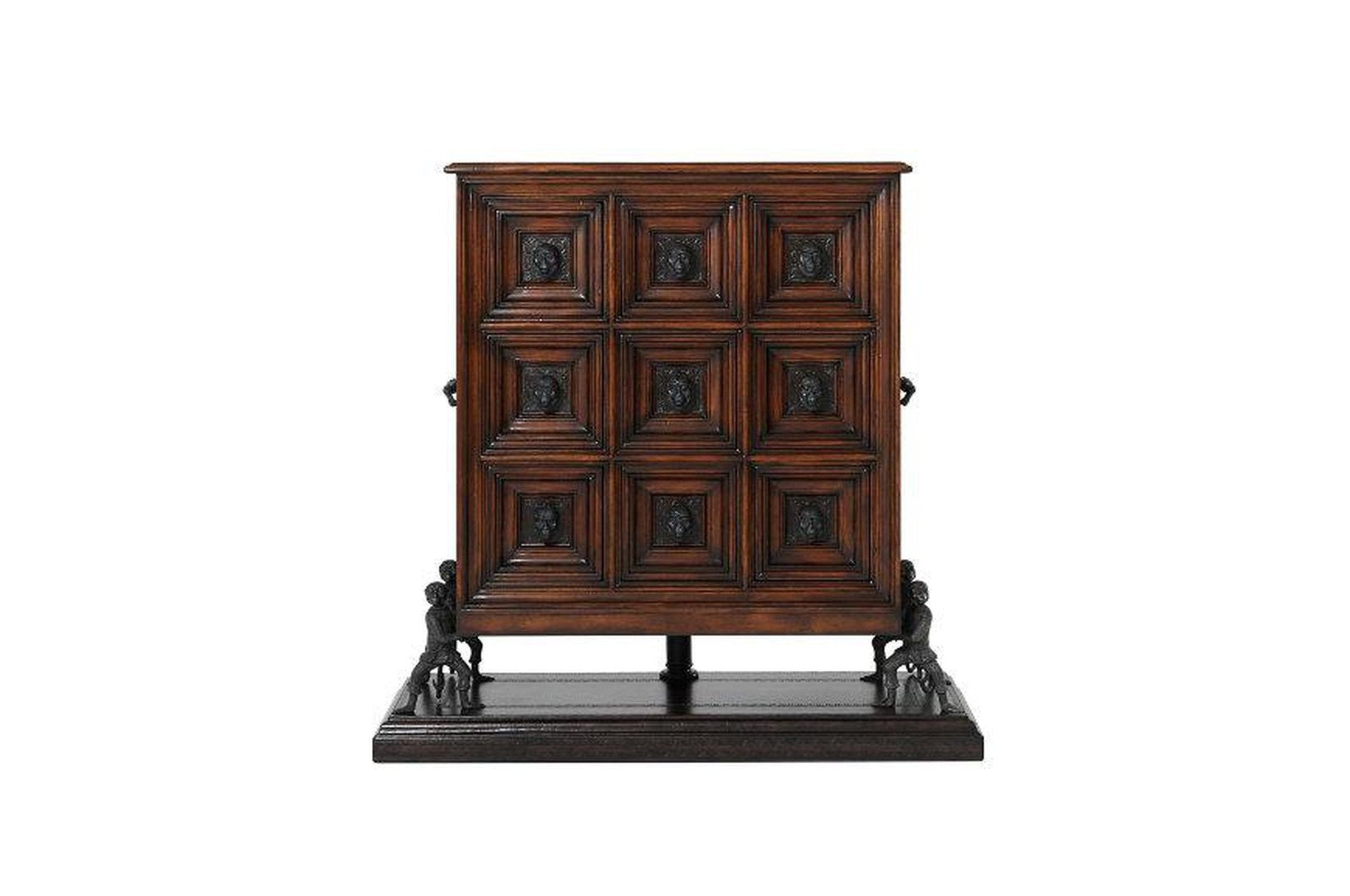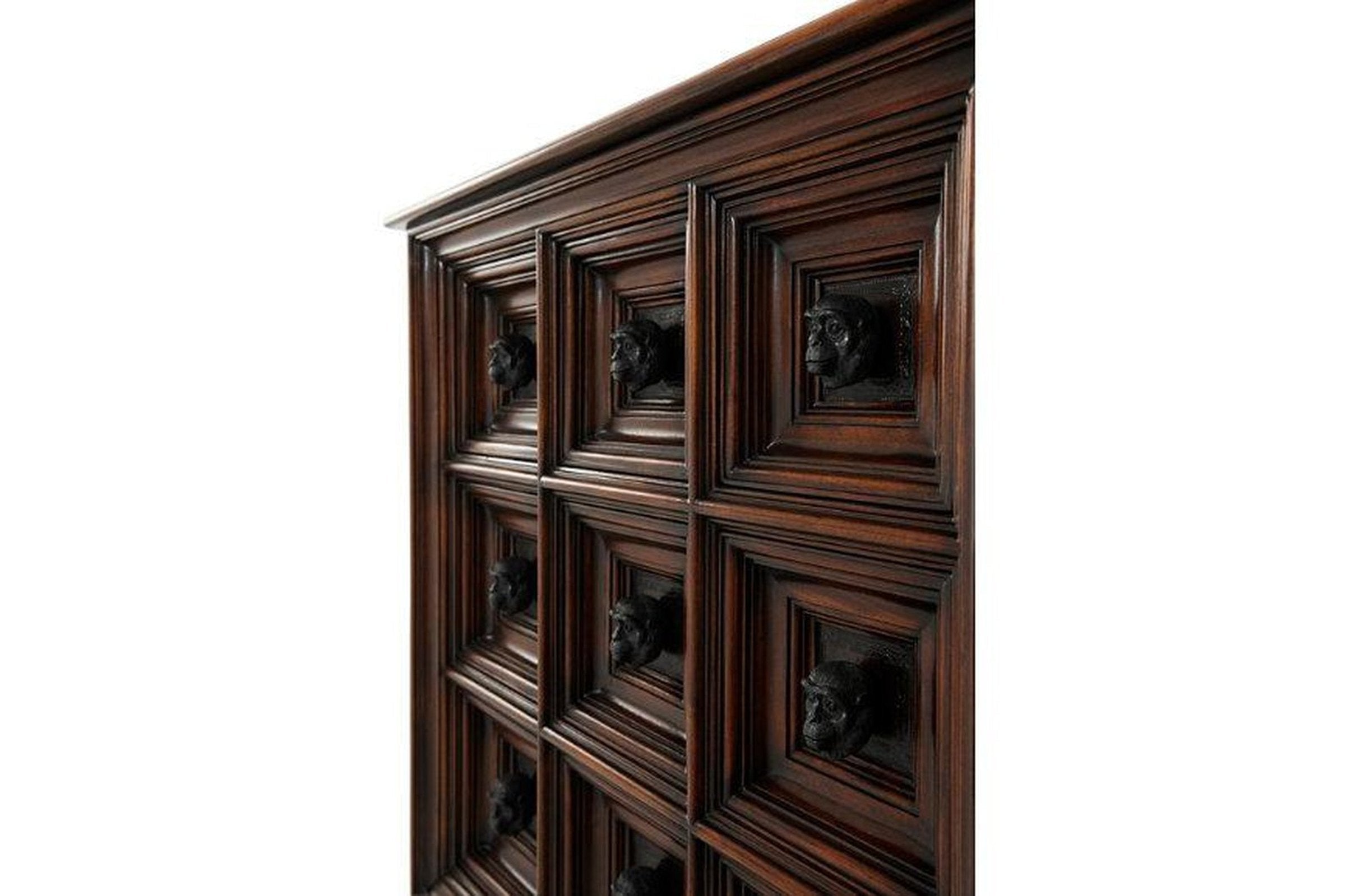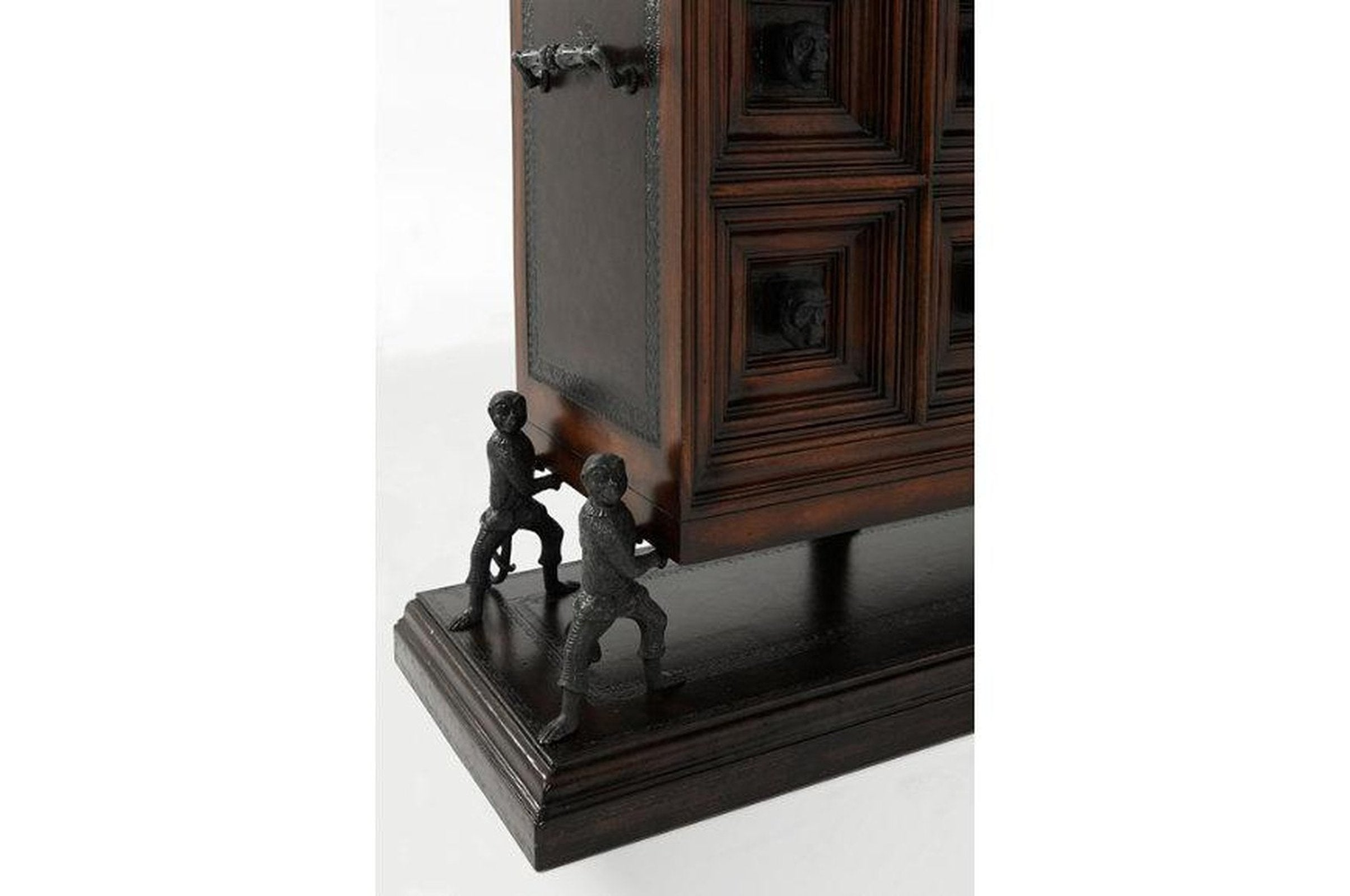 - A leather panel chest on stand, with nine monkey head handled drawers, on four brass monkey supports and a leather plinth base