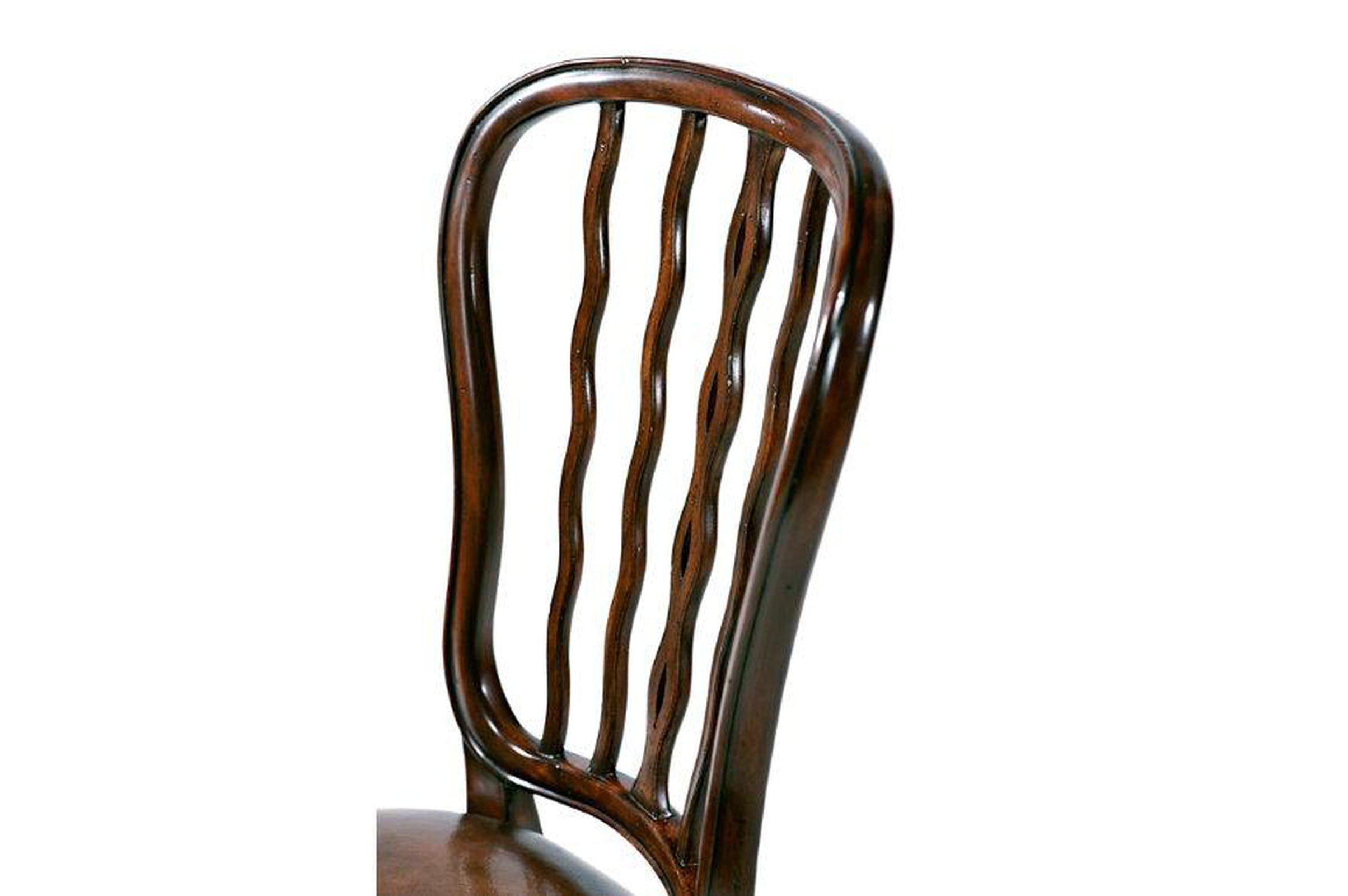 - A mahogany dining chair, the shaped waisted back with serpentine uprights above an upholstered seat, on elegant moulded cabriole legs terminating in spade feet. The original very large set designed by George Seddon circa 1800.