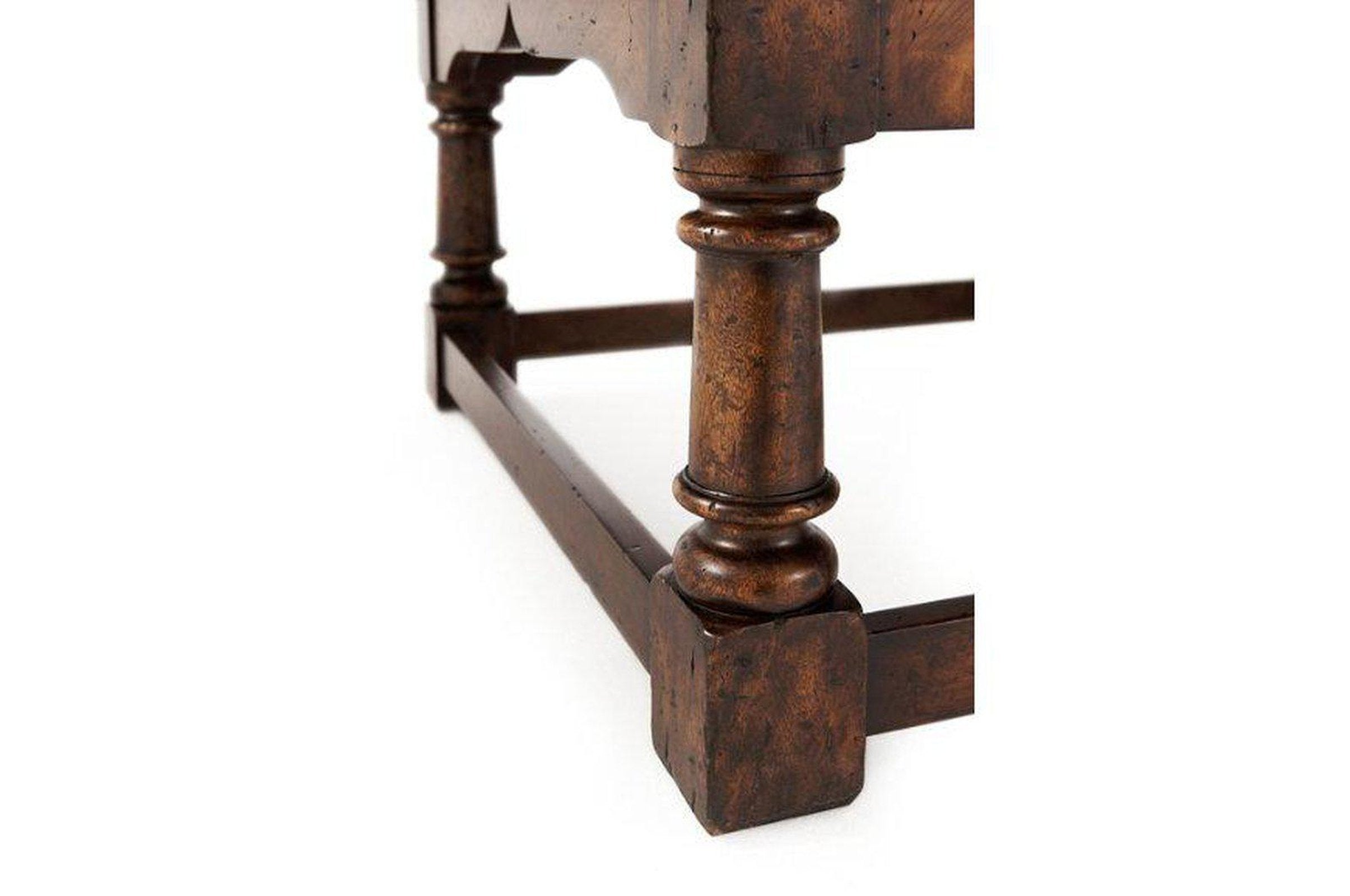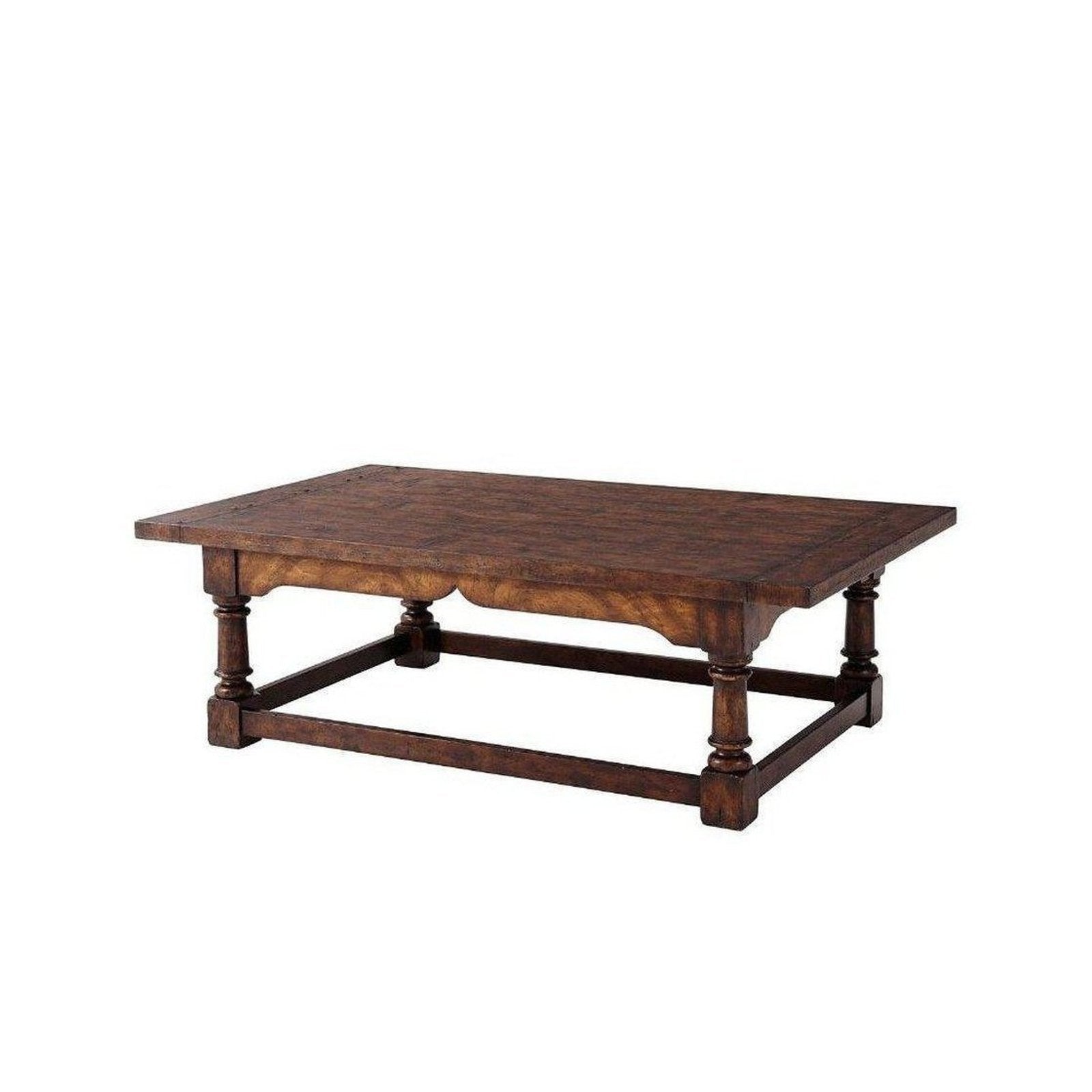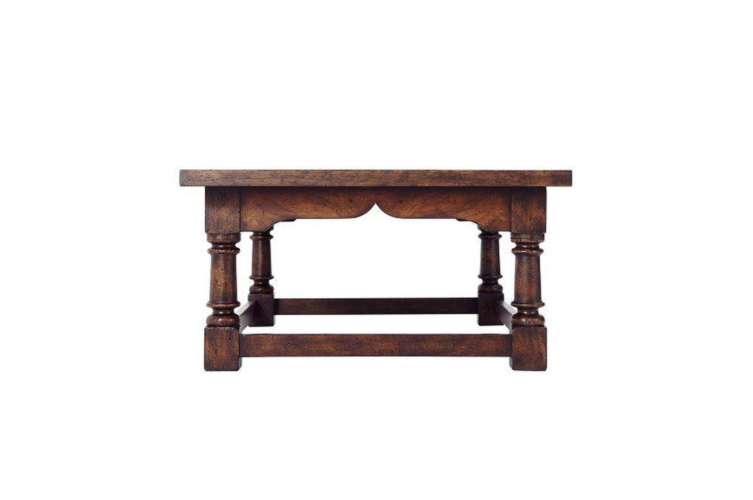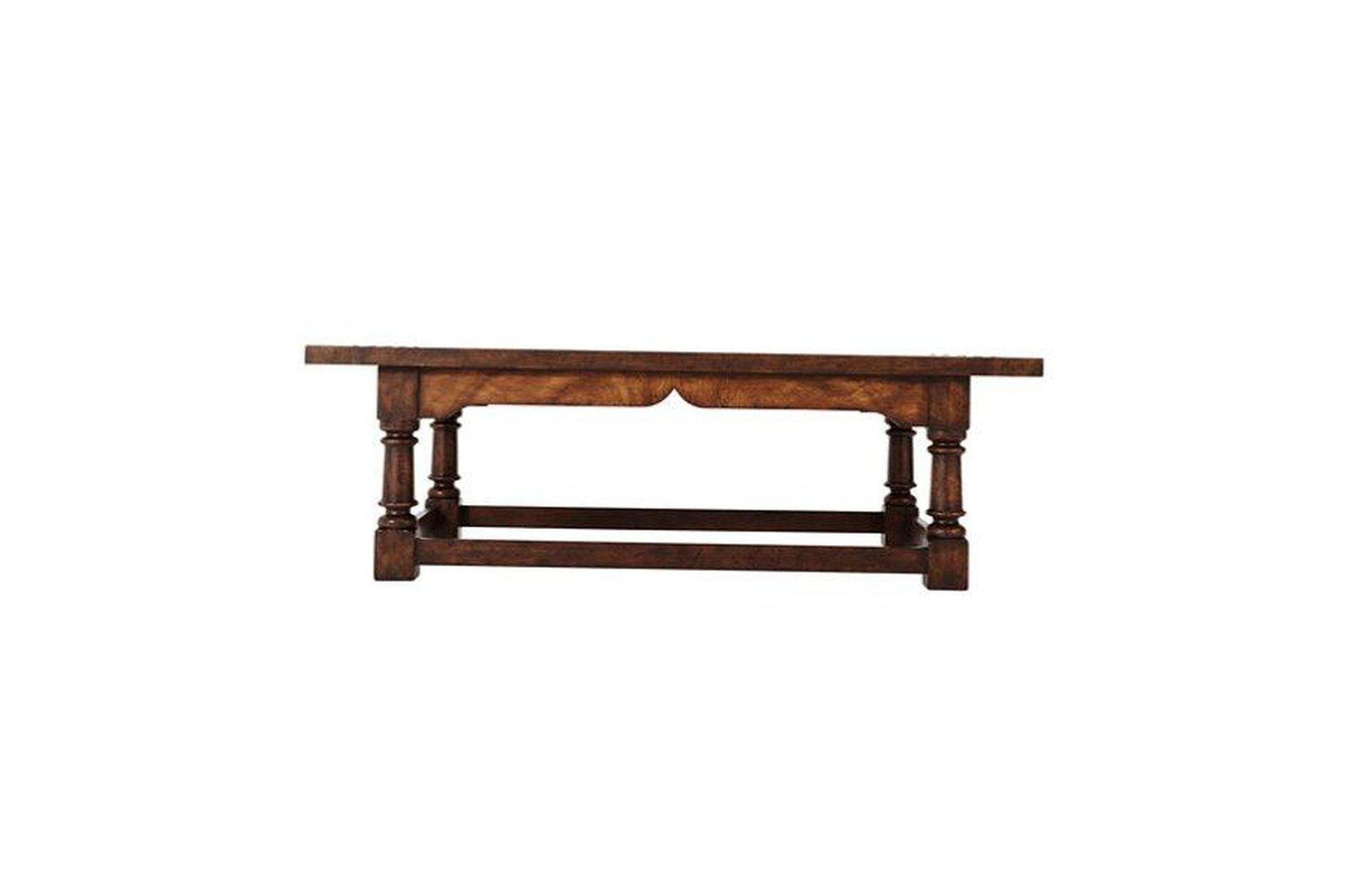 - A reclaimed oak and figured ash veneered refectory cocktail table, the rectangular planked and breadboard top above a figured ash apron, on turned legs and block feet joined by plain stretchers. Inspired by a 17th century refectory table.