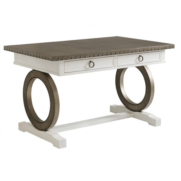 - The top is supported by a pair of decorative metal circles in aged pewter.