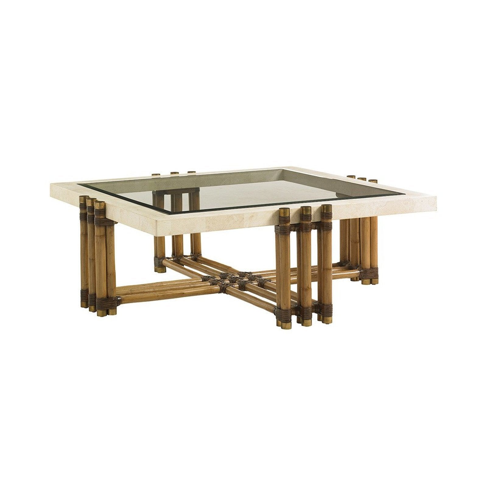 - The square cocktail table gives prominence to the white Cordova stone with its striking brass inlay and inset glass top.