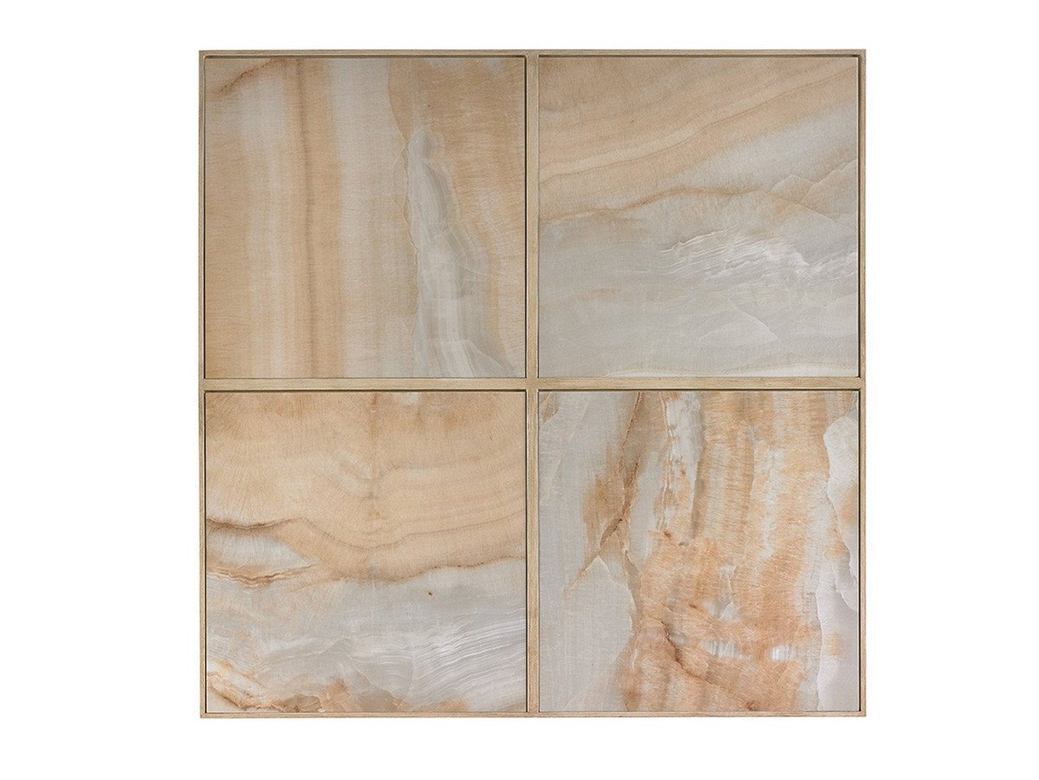- The top features four custom porcelain top inserts, which feature natural marble patterns in ivory and gold.