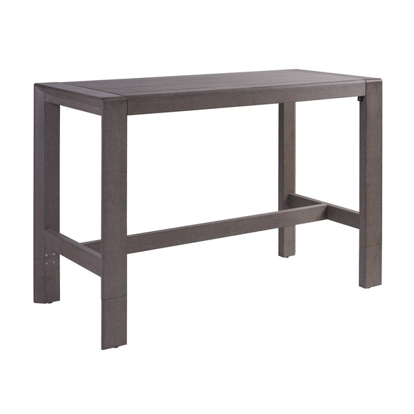 - The bistro table is shipped with integrated leg extensions that allows the piece to be configured at counter or bar height.The slat top design emulates standing water on the tops.