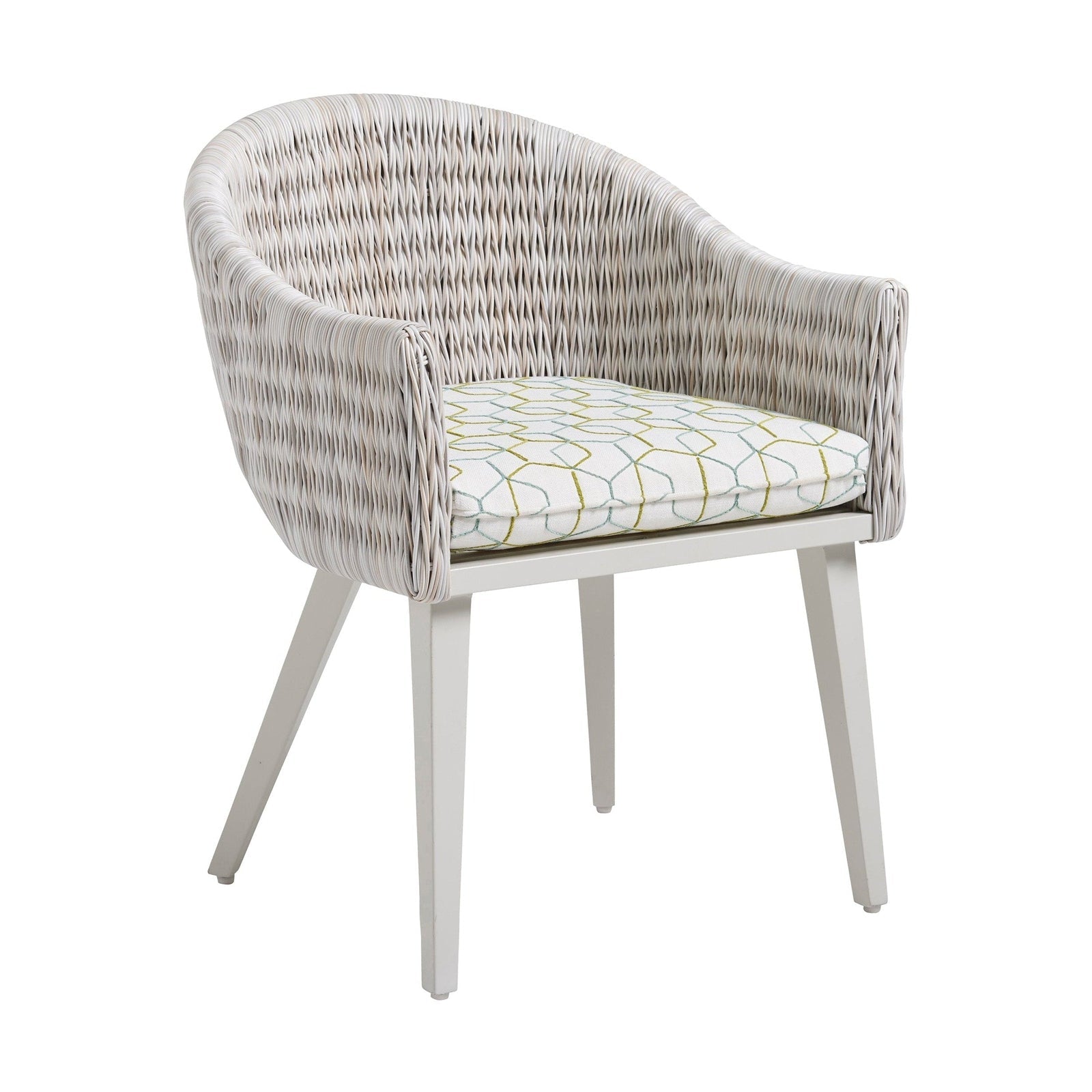 - The arm chair offers a transitional design featuring a soft oyster-white finish on aluminum frames, paired with a herringbone pattern of all-weather wicker in blended tones of ivory, taupe, and gray.