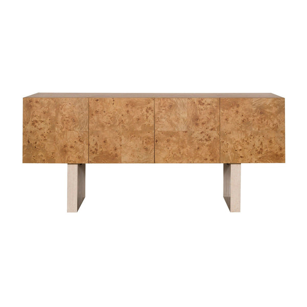 - Four Door Buffet with Finger Pulls on Bottom Edge, Travertine Base with Satin Brass Accents, Three Adjustable Shelves - One Left, One Center and, One Right Sides