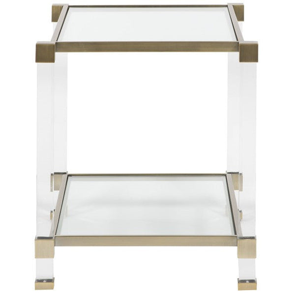 - Acrylic Posts, Glass Top and Shelf, Satin Brass Accents
