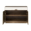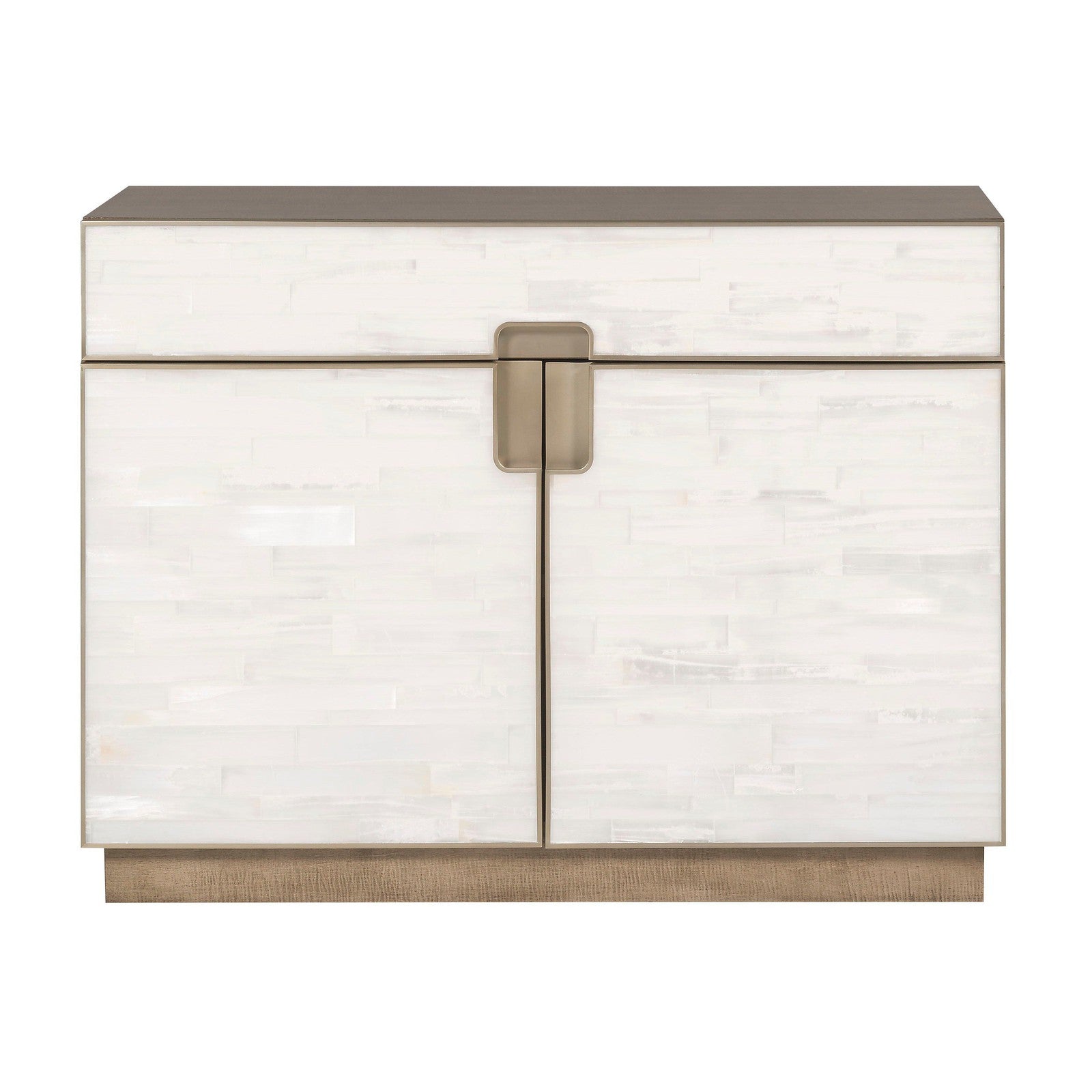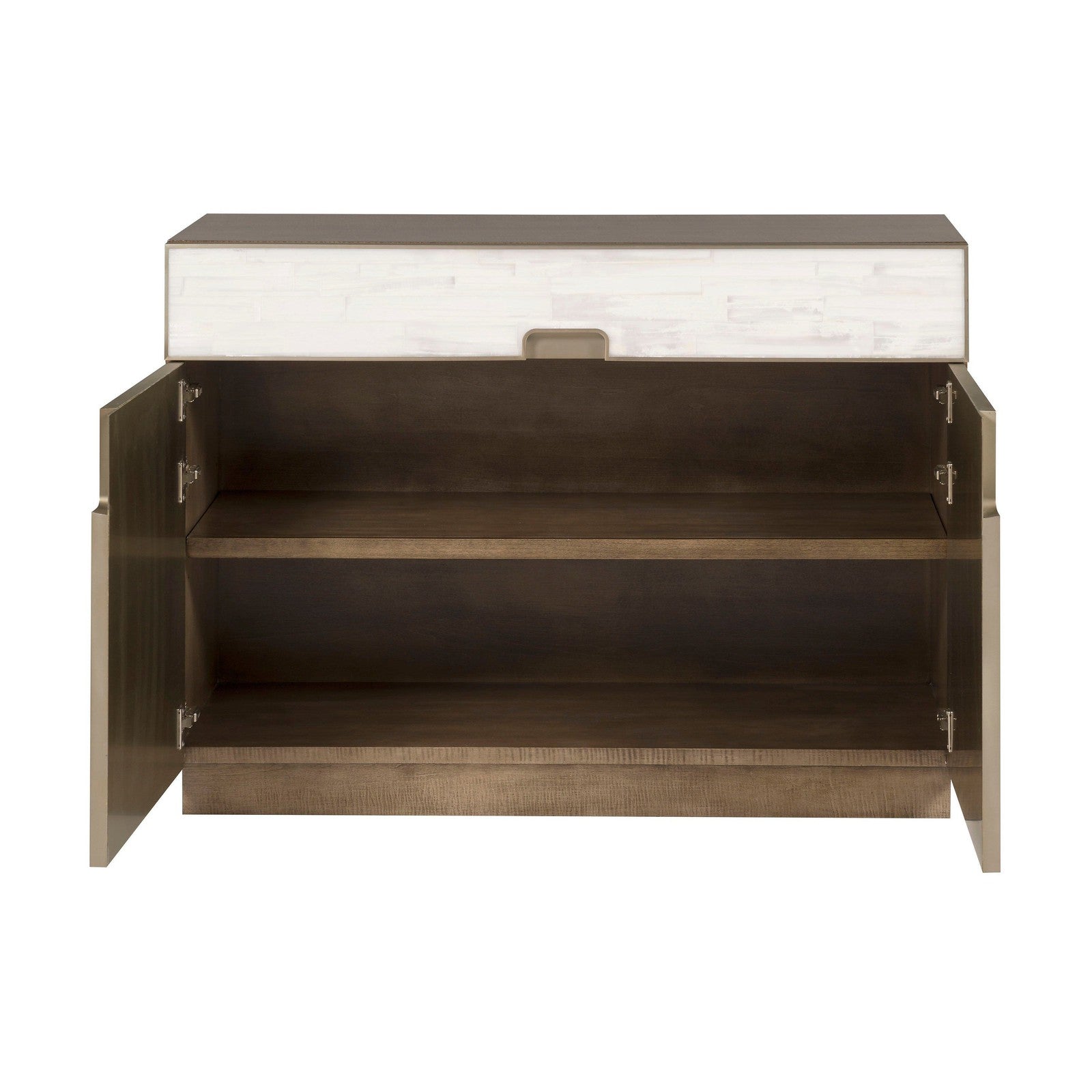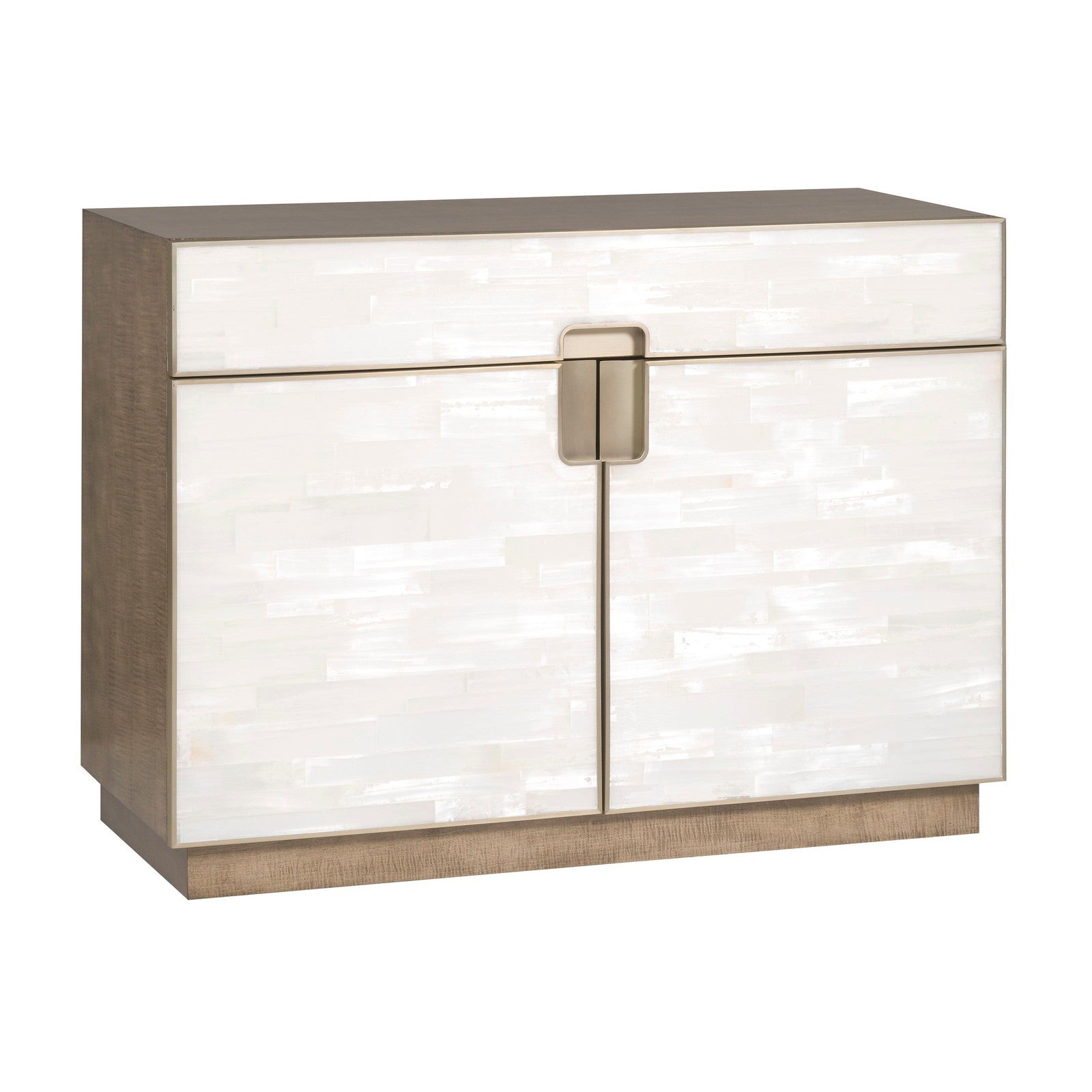 - Soft Bronze Metal Accents, Selenite Drawers and Doors, Bleached Figured Maple Case, One Drawer and Two Doors, One Adjustable Shelf