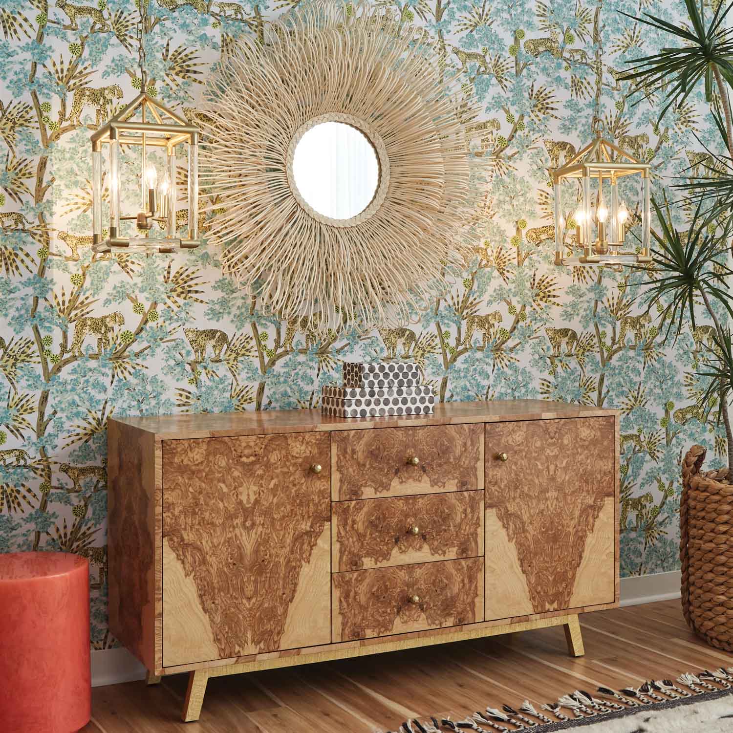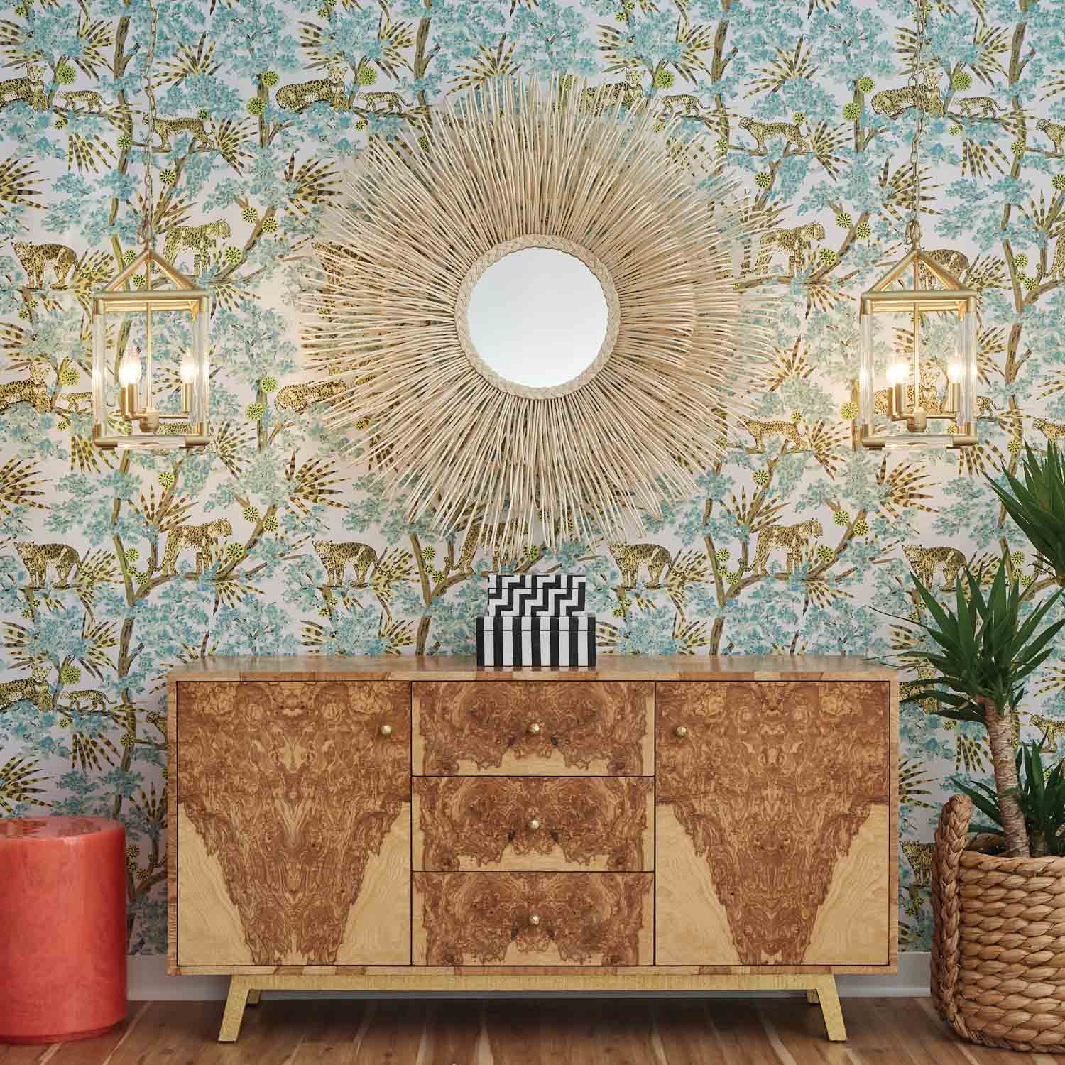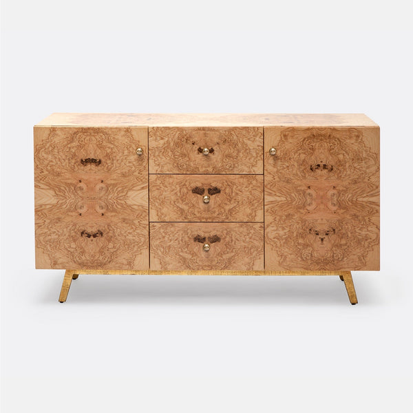 - This buffet's simple silhouette is elevated by the graphic nature of its burled wood finish, featuring incredibly detailed, one-of-a-kind patterns that resemble Rorschach images or ink and water clouds.